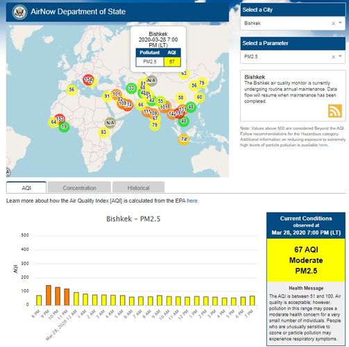Посольство США в Кыргызстане также установило датчик. Он показывает индекс качества воздуха в режиме онлайн. Информация обновляется ежечасно.