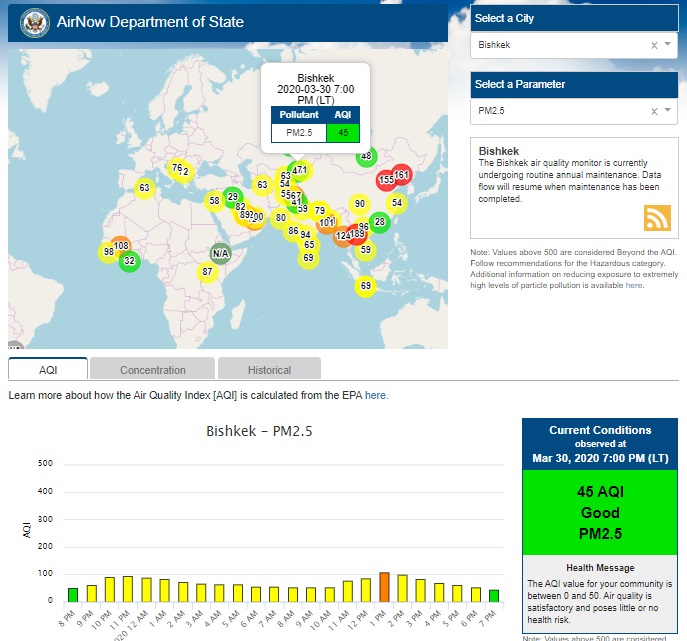 Посольство США в Кыргызстане также установило датчик. Он показывает индекс качества воздуха в режиме онлайн. Информация обновляется ежечасно.