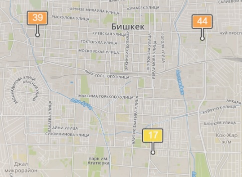 - в районе улиц Бейшеналиевой/Токтогула. Уровень загрязнения превышен в 1,77 раза: PM2.5 среднесуточный — 62 мкг/м³, на момент измерения — 39 мкг/м³;
