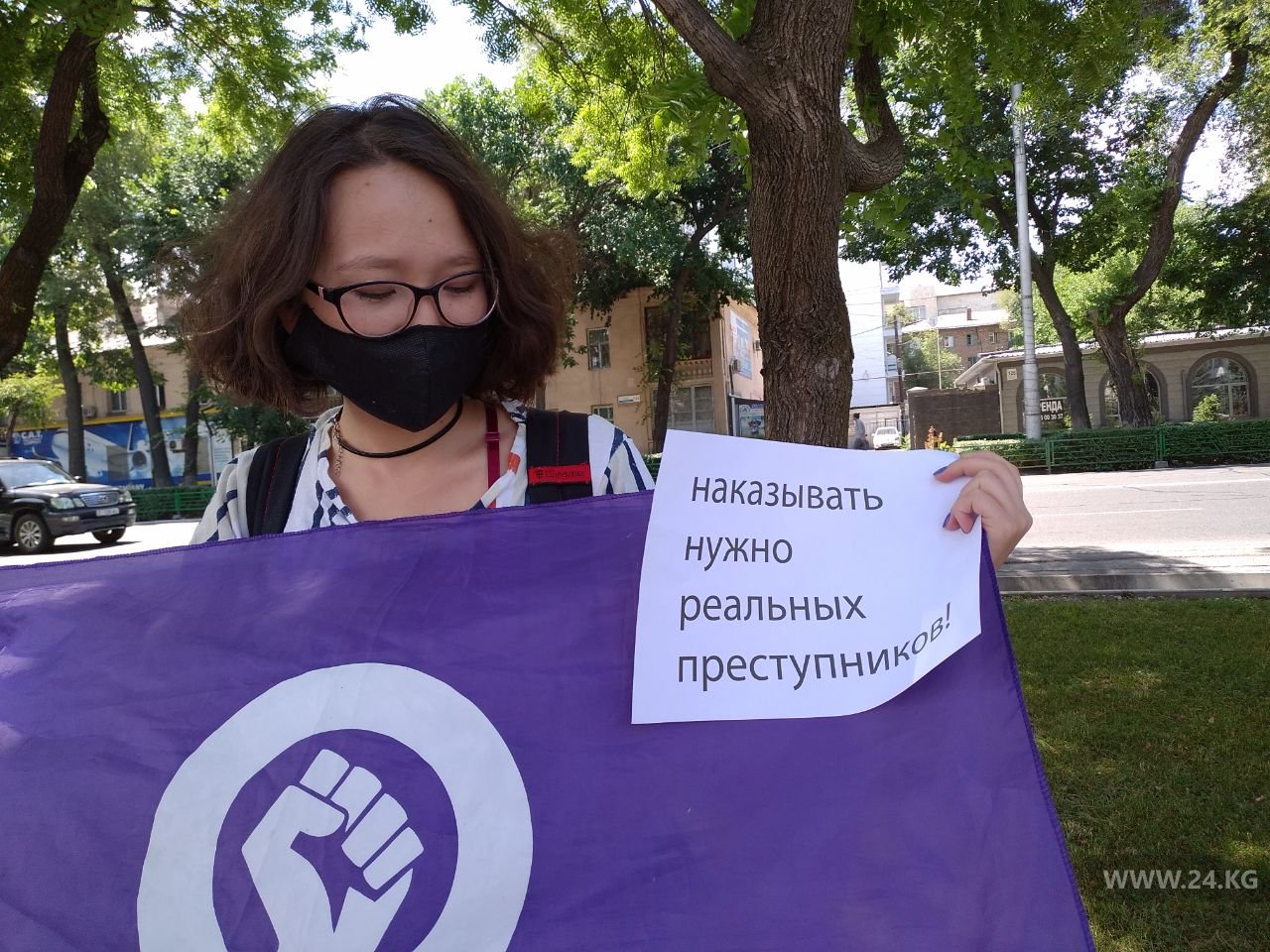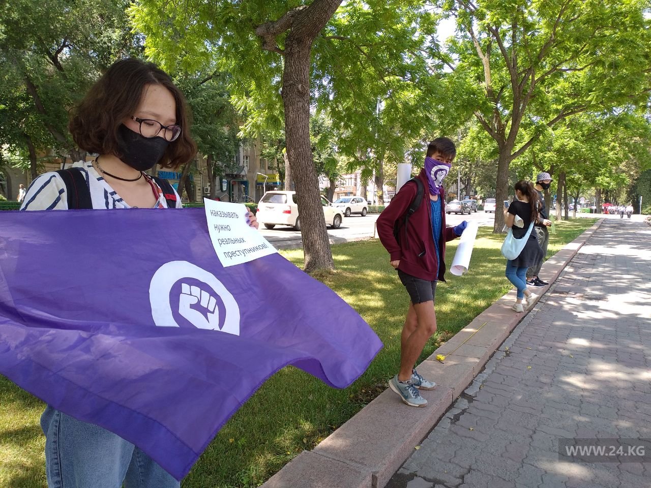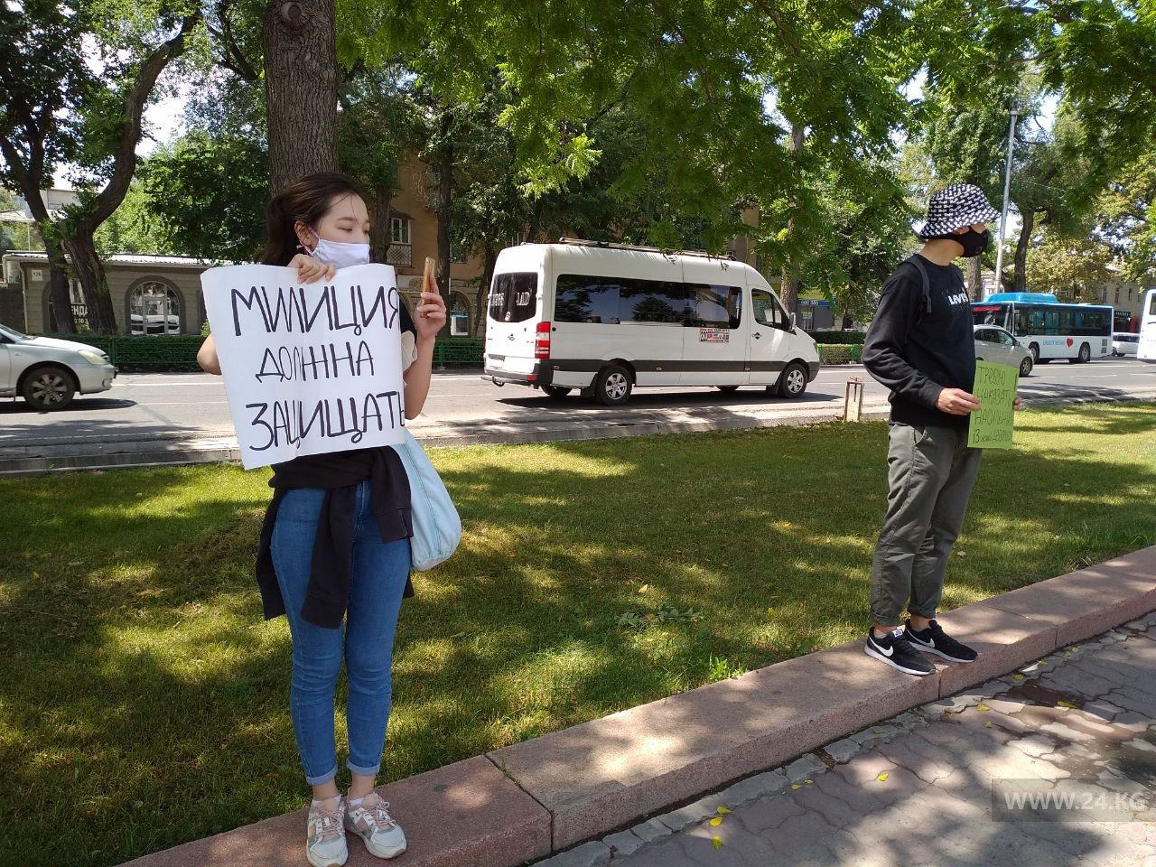 В Бишкеке проходит акция против семейного насилия. Четверо участников, соблюдая дистанцию, встали напротив «Белого дома». Они держат плакаты с призывами: «Милиция должна защищать», «Наказывать надо реальных преступников», «Хватит убивать и насиловать женщин!».