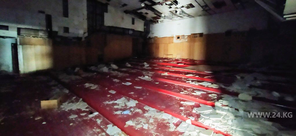 Крыша комплекса разрушена. На стенах повсюду следы потеков от дождя. И это самое опасное, что сегодня происходит с «Иссык-Кулем». Дырявая кровля в непогоду сокращает и без того короткую в ее нынешнем виде жизнь здания. Местами в провалах потолка виднеются ржавеющие конструкции опор.