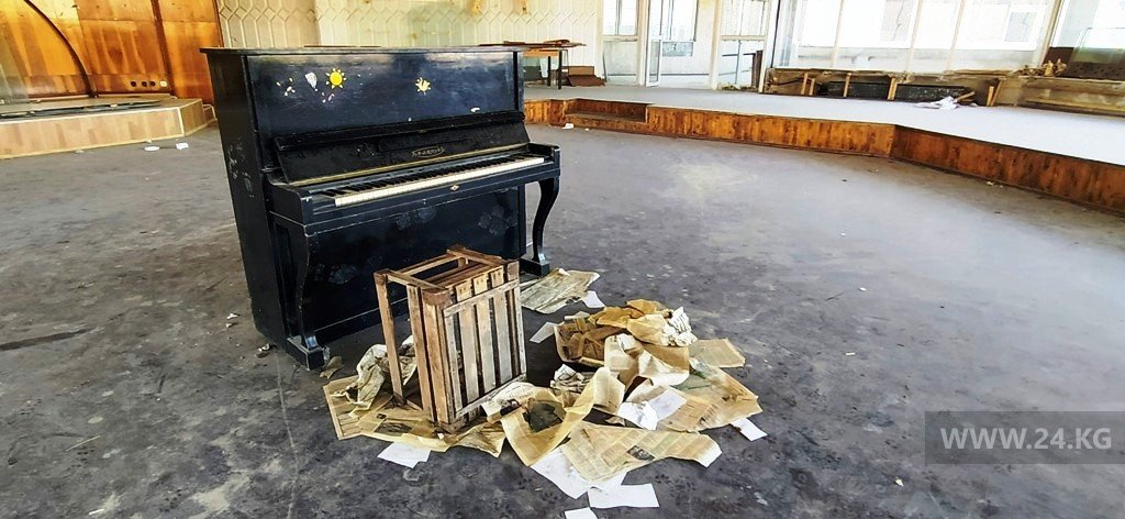 В буклете упоминается и уникальный ресторан, построенный в форме национальной юрты. Сейчас это руины. Первый этаж полностью разбит. Посреди второго — пустого и разграблено этажа стоит чудом уцелевшее, хотя и изрядно потрепанное фортепиано. В коридоре по пути к ресторану на стене осталось датированное ноябрем 2008 года объявление — «4-я Азиатско-Тихоокеанская астрономическая олимпиада». Каких-то 12 лет назад здесь все еще кипела жизнь.