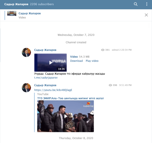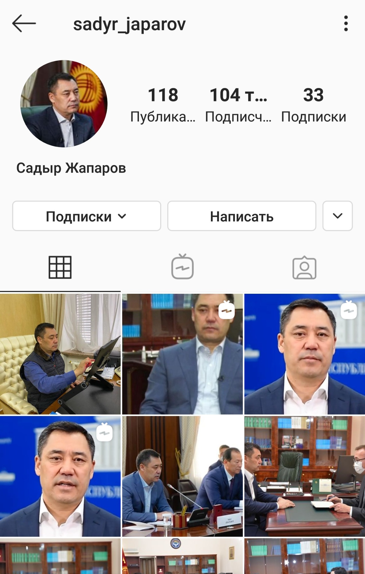 В Telegram-канале Садыра Жапарова чуть больше 2 тысяч 200 подписчиков. Канал создан 7 октября 2020-го. Там политик публикует фотографии, видео и официальные сообщения о своей деятельности.