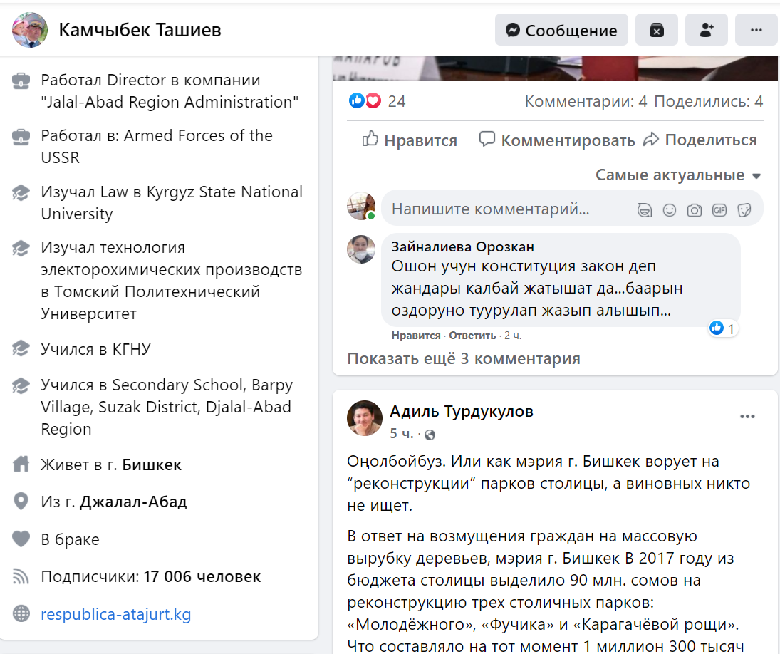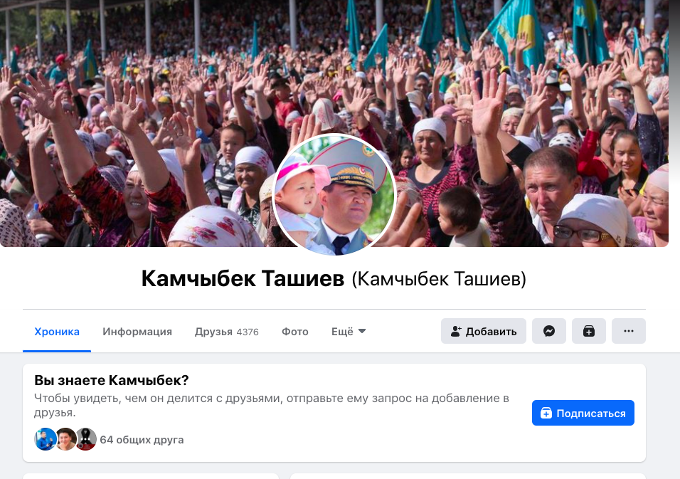 Одна из первых публикаций на странице Facebook Садыра Жапарова сделана в 2012 году, когда он еще был депутатом парламента. Есть также группа в его поддержку, созданная в 2014-м. В ней зарегистрированы 138,3 тысячи подписчиков.