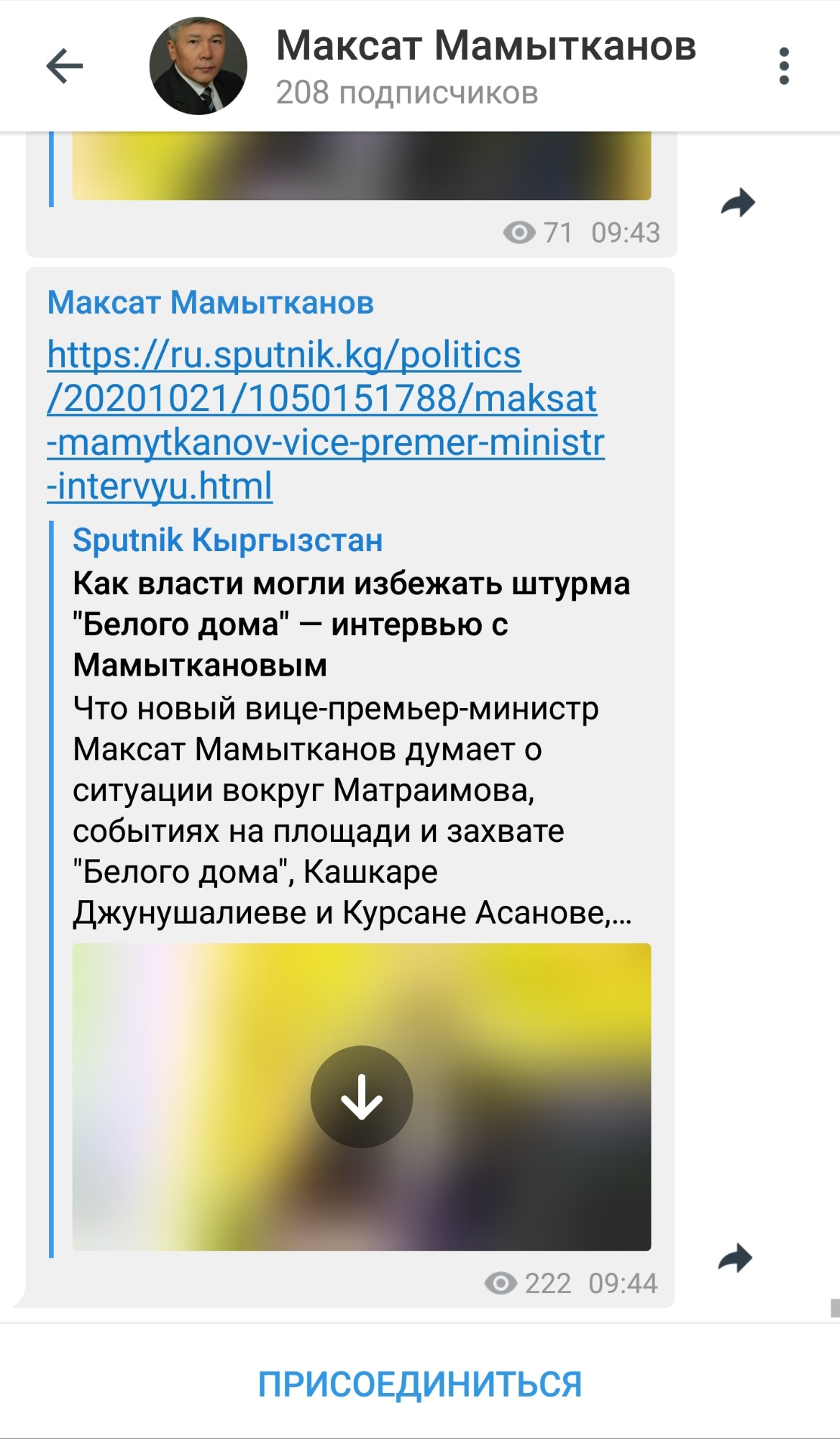 Свой Telegram-канал есть и у вице-премьер-министра и одного из лидеров партии «Чон казат» Максата Мамытканова. Там всего 209 подписчиков, и в последнее время он не так активен.На личной странице в Facebook у чиновника 7 тысяч 102 подписчика и почти 5 тысяч «друзей».