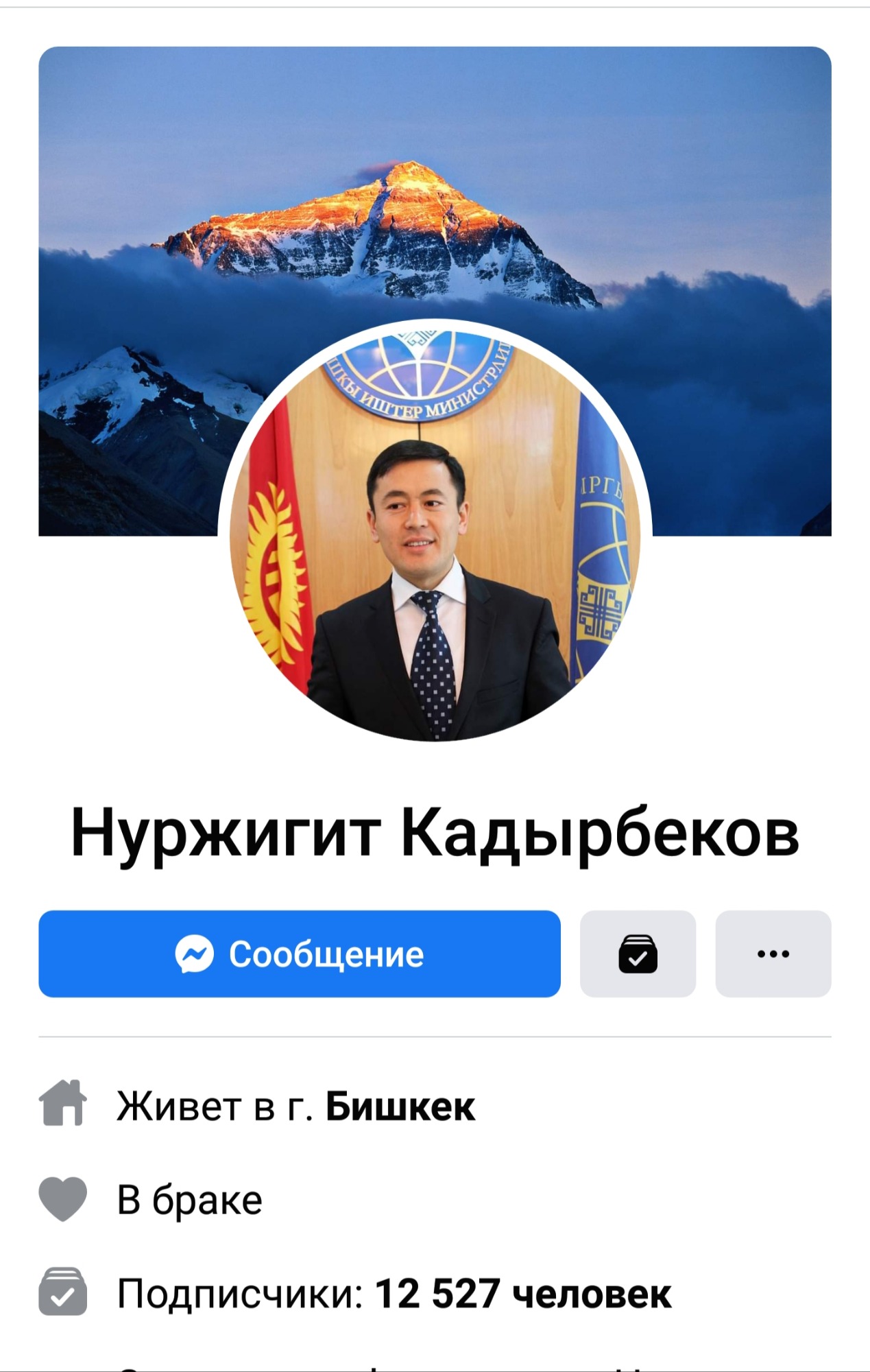 Министр культуры, информации и туризма Нуржигит Кадырбеков — один из немногих в правительстве, кто имеет большую аудиторию в соцсетях. В Facebook у чиновника более 12 тысяч подписчиков, в Instagram — 309 тысяч.У остальных членов кабинета министров, в частности, у первого вице-премьер-министра Артема Новикова, главы Минэкономики Санжара Муканбетова, министра финансов Кыялбека Мукашева и даже у председателя Государственного комитета информационных технологий и связи Алтынбека Исмаилова, активных аккаунтов в соцетях нет.