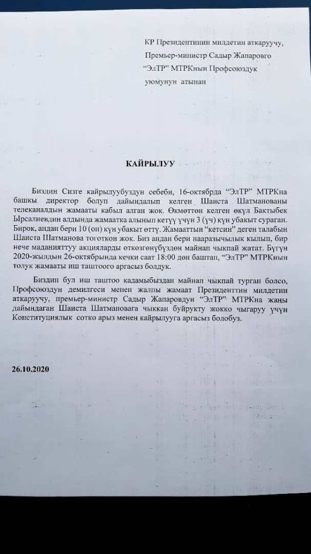 «Шаиста Шатманова назначена 16 октября генеральным директором ЭлТР, но не была принята нашим коллективом. Мы дали три дня представителю правительства Бактыбеку Ырсалиеву для переназначения директора, но с тех пор прошло 10 дней. Сегодня, 26 октября 2020 года, с 18.00 весь коллектив компании ЭлТР оставил свои рабочие места», — написал Сакыбаев.