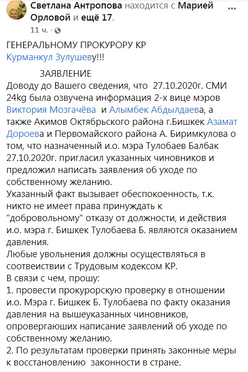 «Это вызывает обеспокоенность, потому что никто не имеет права принуждать к добровольному отказу от должности, и действия и. о. мэра Бишкека Балбака Тулобаева являются оказанием давления. Любые увольнения должны осуществляться в соответствии с Трудовым кодексом», — написала активистка.
