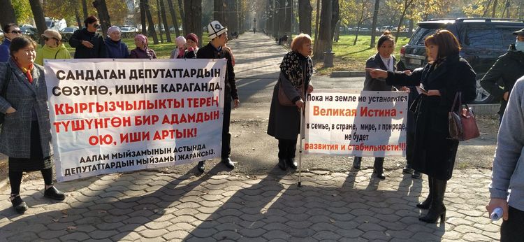 На митинг к зданию ГКНБ, организованный сегодня сторонниками бывшего заместителя министра внутренних дел Курсана Асанова, пришли последователи известного в Кыргызстане неоднозначными высказываниями деятеля Арстана Алая, называющего себя «новым богом». Они развернули свои плакаты.