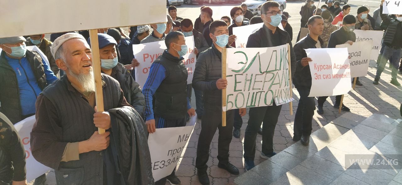 Митингующие обращаются к и. о. президента Садыру Жапарову с требованием освободить Курсана Асанова. По их мнению, он арестован незаконно. На акции собралось около ста человек. Некоторые пришли с детьми. Собравшиеся развернули плакаты с надписями «Руки прочь от генерала Асанова» и «Асанов — народный генерал».