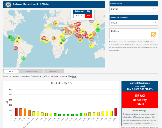 Посольство США в Кыргызстане также установило датчик. Он показывает индекс качества воздуха в режиме онлайн. Информация обновляется ежечасно.