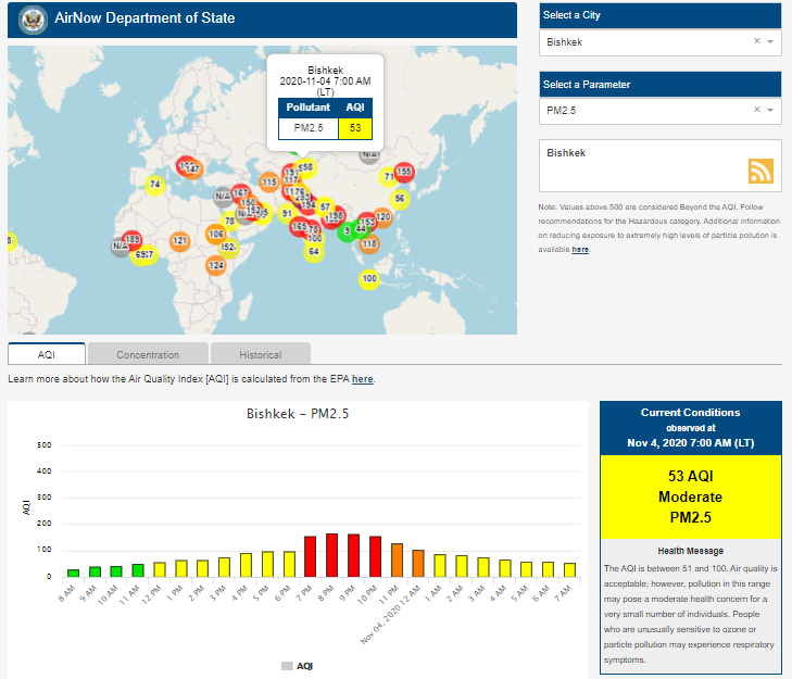 Посольство США в Кыргызстане также установило датчик. Он показывает индекс качества воздуха в режиме онлайн. Информация обновляется ежечасно.
