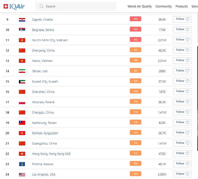 В рейтинге крупнейших городов мира по качеству воздуха World Air Quality на 8.30 Бишкек находится на 20-м месте.