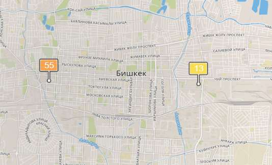 - в районе улиц Бейшеналиевой/Токтогула. Уровень загрязнения превышен почти в два раза: PM2.5 среднесуточный — 73 мкг/м³, на момент измерения — 55 мкг/м³;