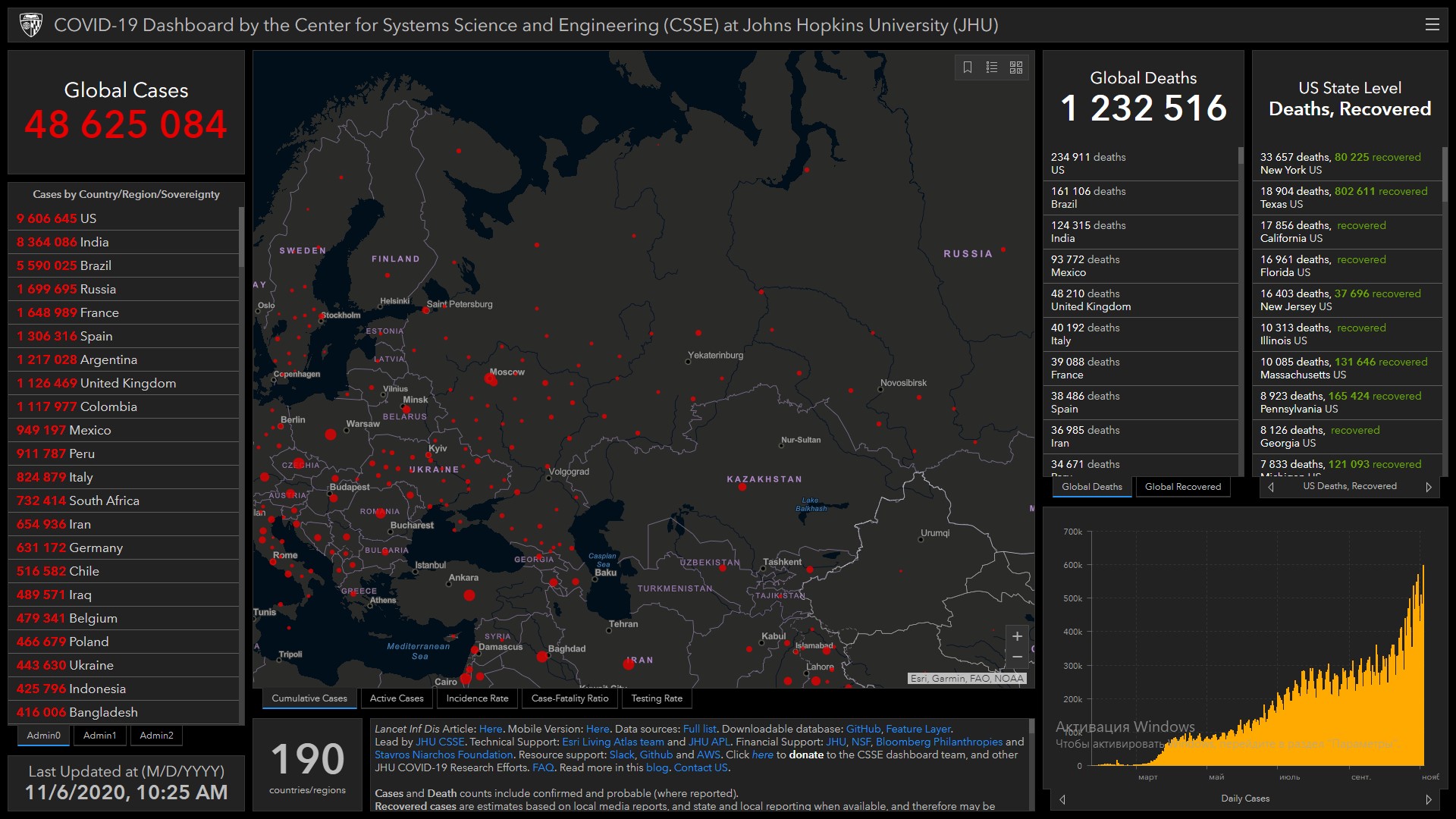 Всего в мире коронавирусом заразились 48 миллионов 625 тысяч 84 человека. Больше всего зараженных в США (9 миллионов 606 тысяч 645), Индии (8 миллионов 364 тысячи 86), Бразилии (5 миллионов 590 тысяч 25), России (1 миллион 699 тысяч 695), Франции (1 миллион 648 тысяч 989), Испании (1 миллион 306 тысяч 316), Аргентине (1 миллион 217 тысяч 28), Великобритании (1 миллион 126 тысяч 469), Колумбии (1 миллион 117 тысяч 977) и Мексике (949 тысячи 197).