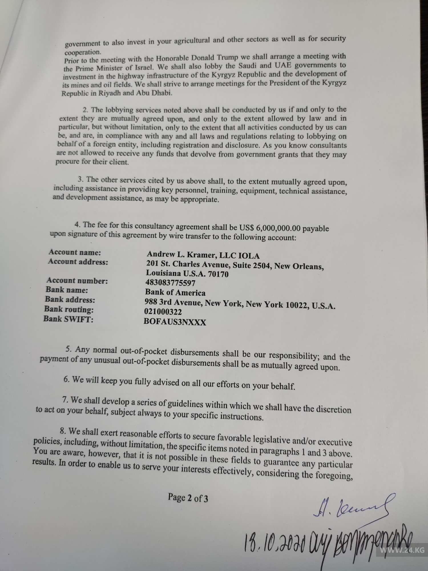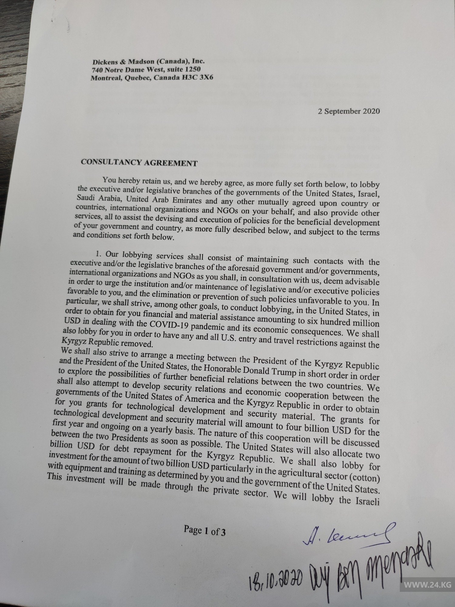 В шапке договора, который он показал журналистам, действительно, стоит дата 2 сентября. Свою подпись Ари Бен-Менаше поставил лишь 18 октября 2020 года. Именно эта дата стоит на каждой странице договора рядом с росписью главы Dickens & Madson. Кроме того, на последней странице есть фраза «on behalf of the Government of Kyrgyz Republic», которую можно перевести как «в интересах правительства Кыргызской Республики» и стоит фамилия и подпись Абдыманапа Карчыгаева.