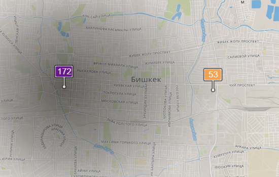 • в районе улиц Бейшеналиевой/Токтогула. Уровень загрязнения превышен в 2,45 раза: PM2.5 среднесуточный — 86 мкг/м³, на момент измерения — 172 мкг/м³;