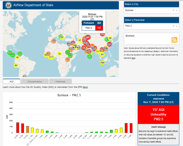 Посольство США в Кыргызстане также установило датчик. Он показывает индекс качества воздуха в режиме онлайн. Информация обновляется ежечасно.