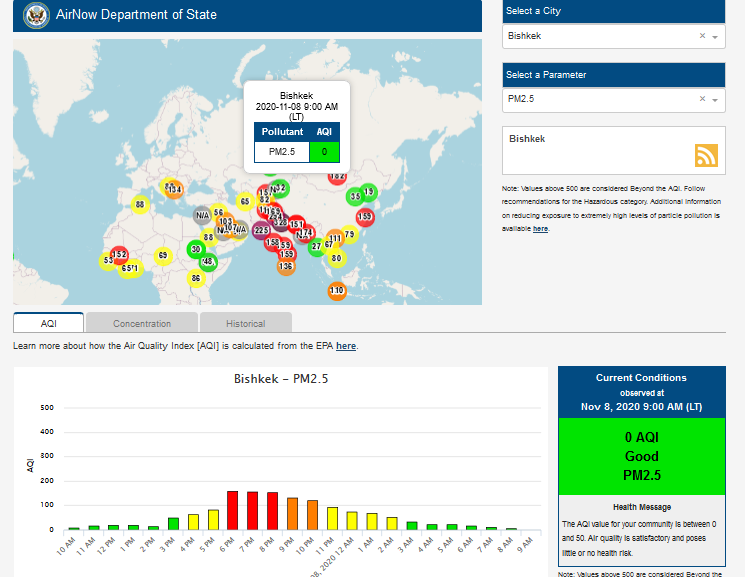 Посольство США в Кыргызстане также установило датчик. Он показывает индекс качества воздуха в режиме онлайн. Информация обновляется ежечасно.