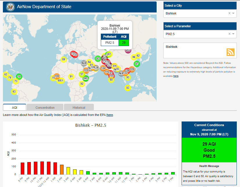 Посольство США в Кыргызстане также установило датчик. Он показывает индекс качества воздуха в режиме онлайн. Информация обновляется ежечасно.