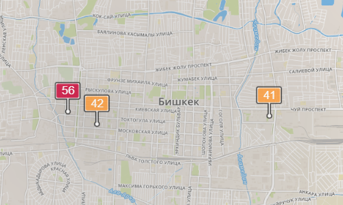 • в районе улиц Бейшеналиевой/Токтогула. Уровень загрязнения превышен в 1,82 раза: PM2.5 среднесуточный — 64 мкг/м³, на момент измерения — 56 мкг/м³;