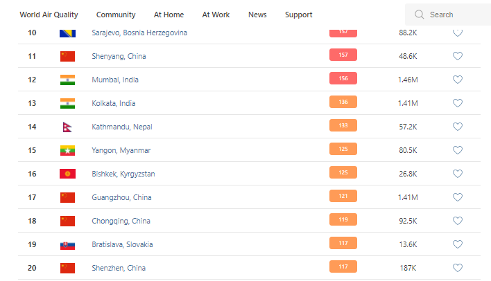 В рейтинге крупнейших городов мира по качеству воздуха World Air Quality на 19.30 Бишкек находится на 16-м месте.