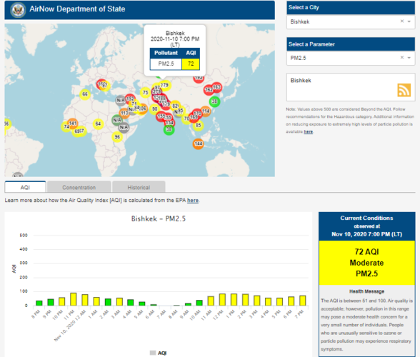 Посольство США в Кыргызстане также установило датчик. Он показывает индекс качества воздуха в режиме онлайн. Информация обновляется ежечасно.