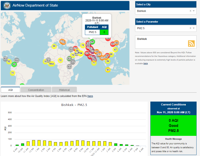 Посольство США в Кыргызстане также установило датчик. Он показывает индекс качества воздуха в режиме онлайн. Информация обновляется ежечасно.