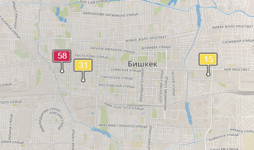 - в районе улиц Бейшеналиевой/Токтогула. Уровень загрязнения превышен в 1,4 раза: PM2.5 среднесуточный — 49 мкг/м³, на момент измерения — 58 мкг/м³;