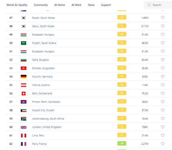 В рейтинге крупнейших городов мира по качеству воздуха World Air Quality на 8.30 Бишкек находится на 53-м месте.