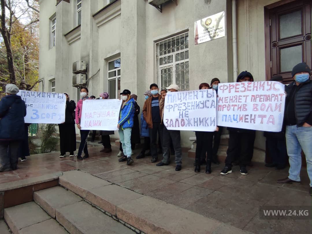Протестующие вышли с транспарантами, где написано, что «Пациенты фрезениуса не заложники». Отметим, что «Фрезениус Медикал Кеа» — это гемодиализный центр.По словам митингующих государство перечисляет в центр по 6 тысяч 812 сомов на одного пациента, в том время как остальным гемодиализным организациям через Фонд обязательного медицинского страхования переводят по 4 тысячи 700 сомов.