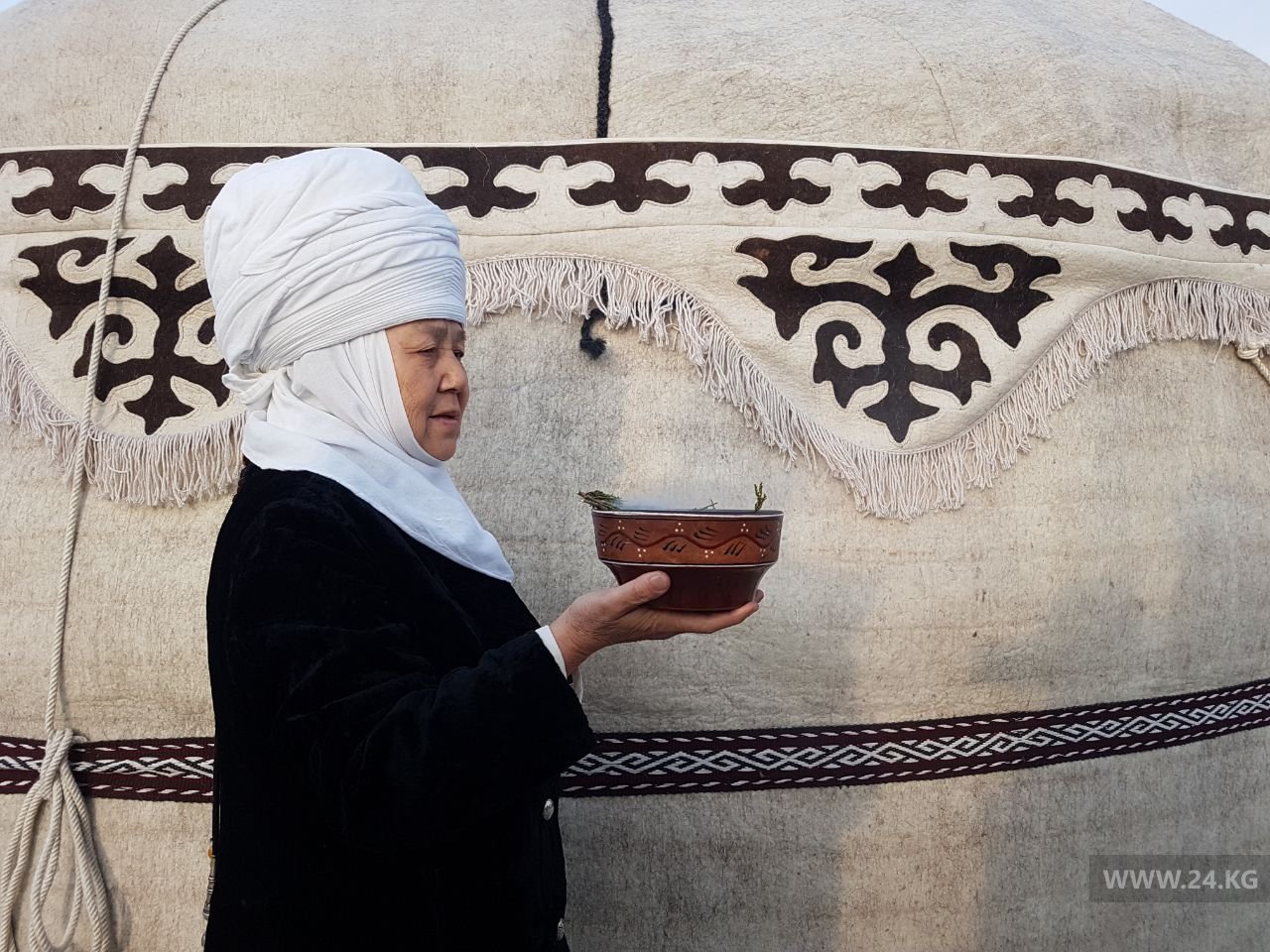 Перед началом церемонии сказания у манасчи Доолота Сыдыкова измерили вес и давление.