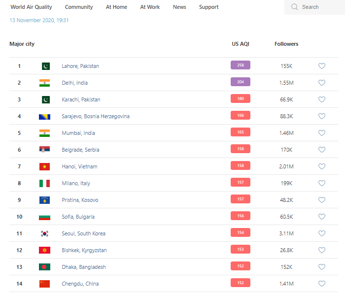В рейтинге крупнейших городов мира по качеству воздуха World Air Quality на 19.30 Бишкек поднялся на 12-е место.
