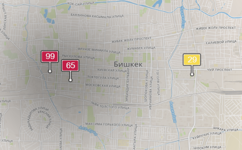 - в районе улиц Бейшеналиевой/Токтогула. Уровень загрязнения превышен в 1,54 раза: PM2.5 среднесуточный — 54 мкг/м³, на момент измерения — 99 мкг/м³;