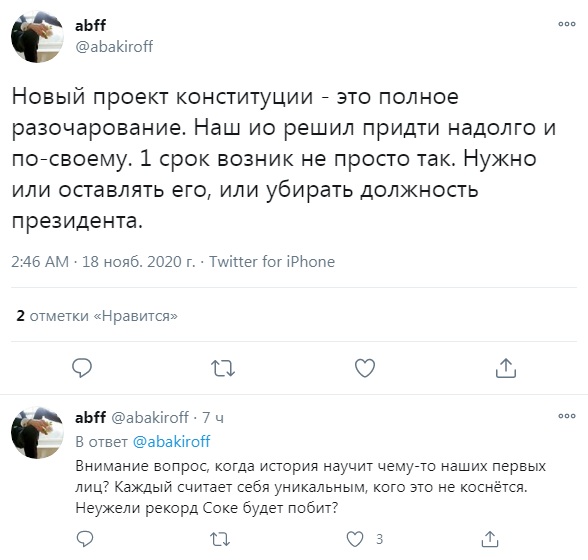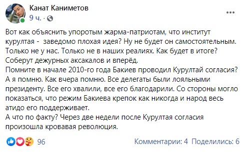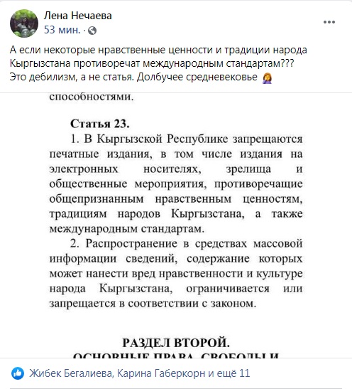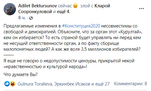 В Facebook отдельные кыргызстанцы посчитали, что предлагаемые изменения несовместимы со свободой и демократией.Действующий депутат парламента Дастан Бекешев тоже высказался в адрес своих коллег.