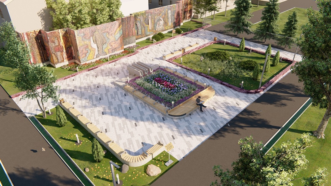 Эскизом предусматривается улучшение состояния территории с заменой уличной мебели и покрытия тротуаров, площадок и установкой нового освещения. Помимо этого предлагается открыть взору панно, установить подсветку, убрать на участке заросшую растительность, посадить деревья и обустроить цветники.