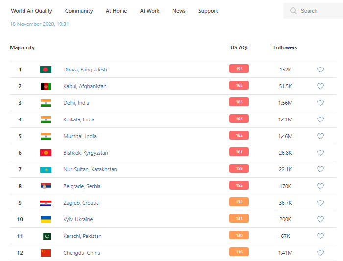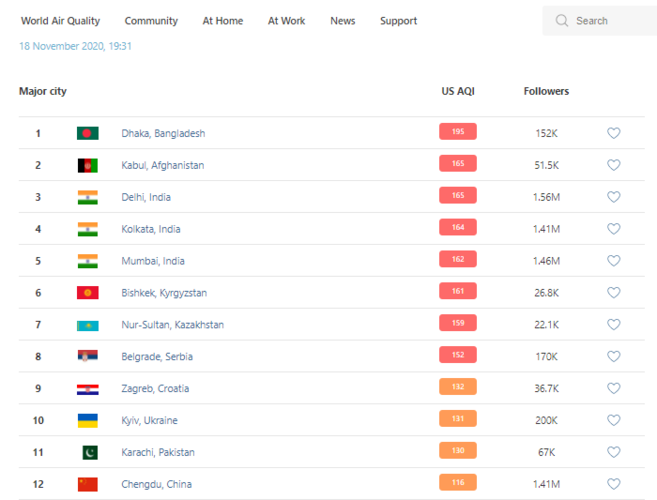 В рейтинге крупнейших городов мира по качеству воздуха World Air Quality на 19.30 Бишкек поднялся на 6-е место.
