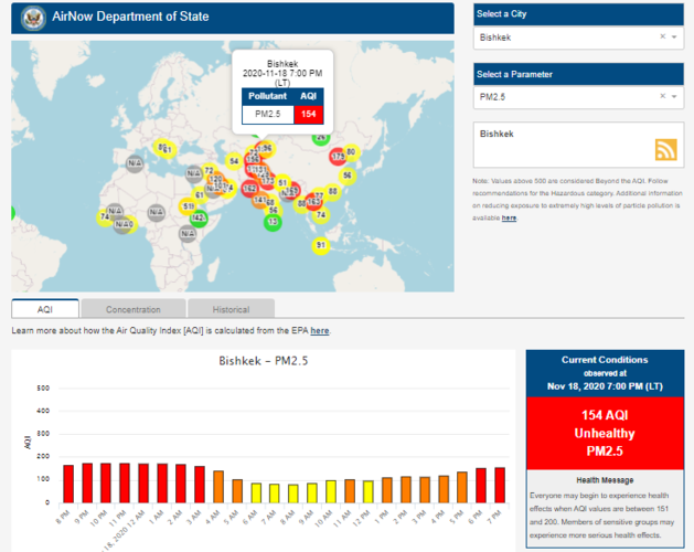 Посольство США в Кыргызстане также установило датчик. Он показывает индекс качества воздуха в режиме онлайн. Информация обновляется ежечасно.
