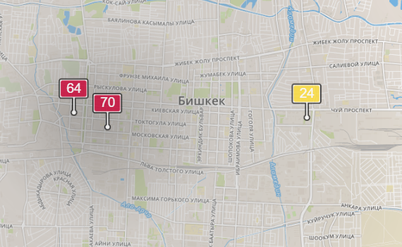 - в районе улиц Бейшеналиевой/Токтогула. Уровень загрязнения превышен в 1,88 раза: PM2.5 среднесуточный — 66 мкг/м³, на момент измерения — 64 мкг/м³;