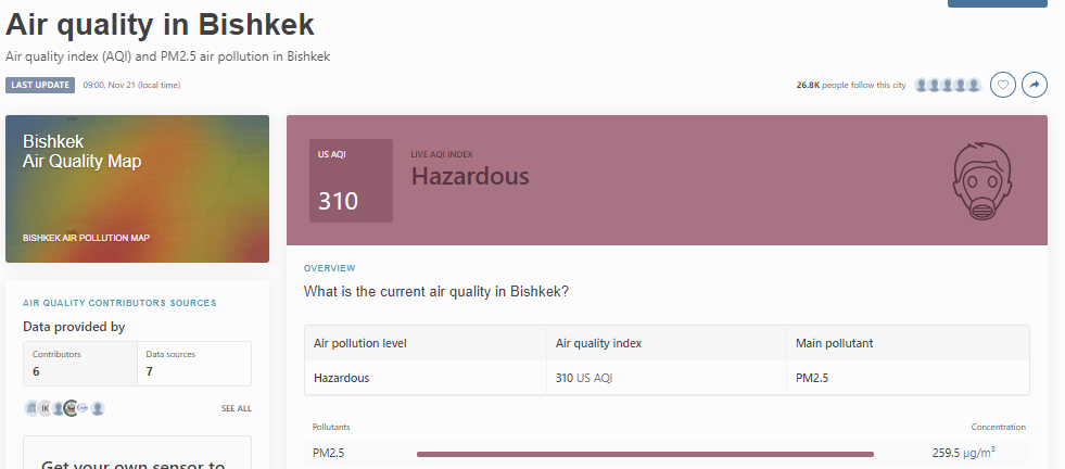 В 9.30 статус города отмечен как «опасно» (Hazardous). Индекс качества воздуха, по данным сайта, составляет 310 (AQI), а замеры концентрации мелких частиц PM2.5 показали 259,5 мкг/м³.