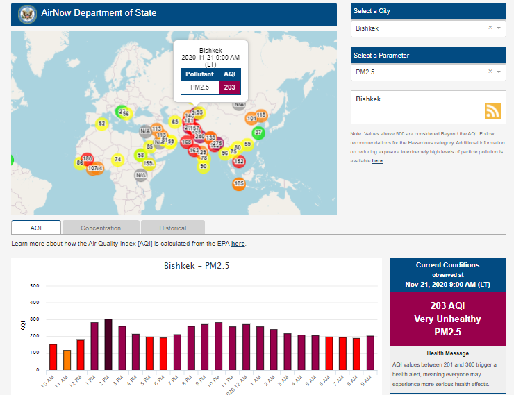 Посольство США в Кыргызстане также установило датчик. Он показывает индекс качества воздуха в режиме онлайн. Информация обновляется ежечасно.