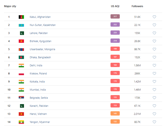 В рейтинге крупнейших городов мира по качеству воздуха World Air Quality Бишкек опустился на 4-е место.