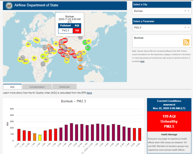 Посольство США в Кыргызстане также установило датчик. Он показывает индекс качества воздуха в режиме онлайн. Информация обновляется ежечасно.