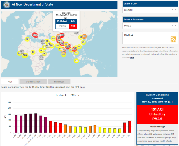 Посольство США в Кыргызстане также установило датчик. Он показывает индекс качества воздуха в режиме онлайн. Информация обновляется ежечасно.