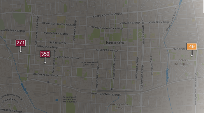 - в районе улиц Бейшеналиевой/Токтогула. Уровень загрязнения превышен в 4,1 раза: PM2.5 среднесуточный — 144 мкг/м³, на момент измерения — 271 мкг/м³;