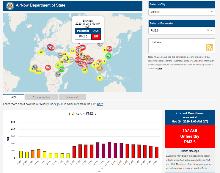 Посольство США в Кыргызстане также установило датчик. Он показывает индекс качества воздуха в режиме онлайн. Информация обновляется ежечасно.