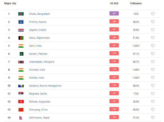 В рейтинге крупнейших городов мира по качеству воздуха World Air Quality на 8.30 Бишкек опустился на 12-е место.