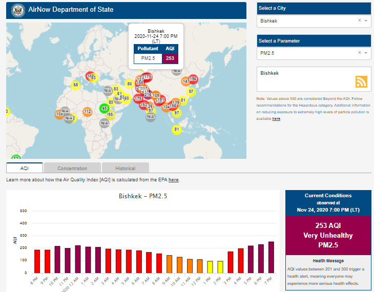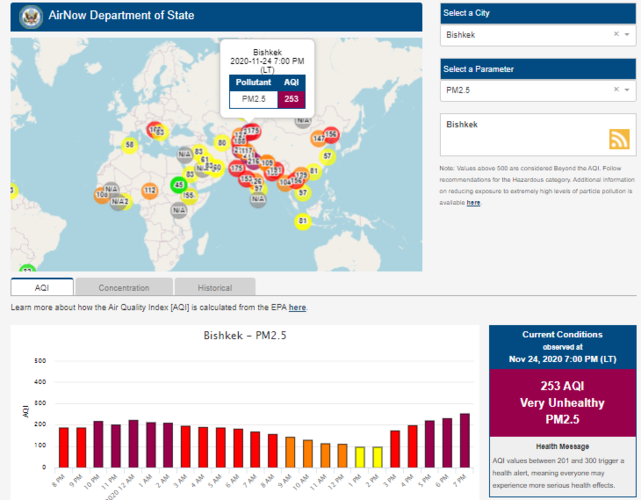 Посольство США в Кыргызстане также установило датчик. Он показывает индекс качества воздуха в режиме онлайн. Информация обновляется ежечасно.