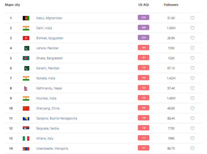 В рейтинге крупнейших городов мира по качеству воздуха World Air Quality на 19.30 Бишкек поднялся на 3-е место.