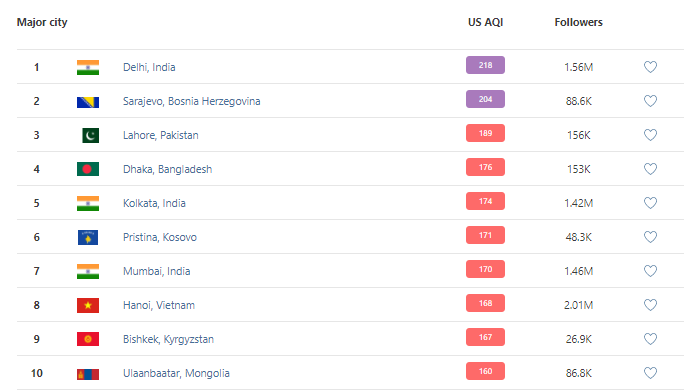 В рейтинге крупнейших городов мира по качеству воздуха World Air Quality на 19.30 Бишкек поднялся на 9-е место.